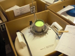 さて、上の写真の物体は液体窒素を充填した容器で、中には雄牛から採取した精液がストローに充填されて保管されています。人工授精の際にはこのストローを容器から一本取り出し、人工授精用の装置(注射器のようなもの)に取り付け雌牛に種付けします。