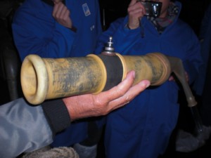 こちらが採精管です。暖房機の中で保温し、使用するときに取り出します。筒の内側はゴム風船状になっていて、器具上部の金属に口で空気を送り込むと膣圧と類似したコンディションを再現できるといいます。採取された精液は試験管内に溜まります。