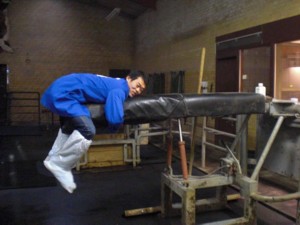こちらは実際には使われていませんが偽雌台という道具。雄の大動物(牛とは限りません)が興奮して乗っかった時に精液を採取します。
