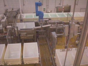 Høgelundのチーズ工場はちょうど今生産ラインの改築中で乳からの生産が見られなかったのですが、面白かったのは乳にスターターやレンネット(チーズの素)を入れる段階で、桶を使わずユニットに分けられた小さなバスタブ状の容器を利用しているところです。