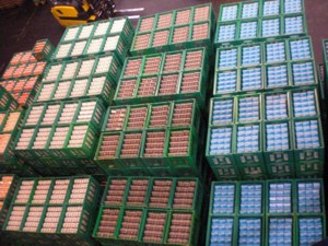 この工場では製品を緑色の規定ボックス(1箱牛乳パック15本いり)に詰めて輸送するそうです。