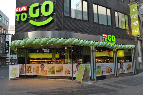 ドイツ第二大手(一位はEdeka)スーパーのRewe から新しい試みです。4月19日第一号"Rewe to Go",(to go=お持ち帰り) がケルンのメインどおりの1つにお目見えです。主流商品は「その場で食べられる」サンドイッチ、お寿司、加工済み食品、コーヒーなど「お持ち帰りの人気商品」に加えてスナック、お菓子などおよそ1000種類。よく冷えた飲み物のコーナーの横には自由に使える電子レンジもついています。「レンジでチン」で出来上がる冷凍食品なども食べられます。