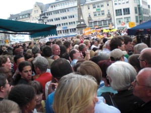 それで、昨日(8月25日)はボンの市場広場にドイツの首相アンゲラ=メルケルが、自分の所属する党CDU(ドイツキリスト教民主同盟)の応援演説をするということでやってきました。