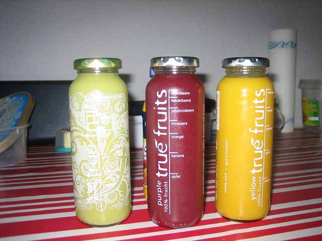 2004年、スコットランドの留学先で当たり前のように店先に並んでいたスムージーがドイツでも飲みたいと思い立ったのが事の発端。2005年のテスト販売期間を経て(大学の食堂などで今より安い値段でおいていました)マーケティングに乗り出した2006年は月に1万本(売り上げていたスムージーも今では月に平均50万本の売り上げとか。3人でスタートした会社も現在は15人の正社員を抱える中小企業に成長しました。今ではどこのスーパーでも何社かの「スムージー」を見かけますが、ドイツの元祖はtrue fruitsです。