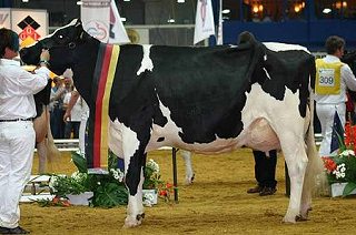 彼女はすでにまだお産を経験していなかったときも部門賞を獲得、昨年は2年に1開催されている「ドイツホルスタイン品評会」で優勝しています。ちなみに彼女の父牛も優秀で、高等な牛は遺伝によるものが大きいというのも納得がいきます。各章受賞者のリストには母牛と父牛の名前が明記されています。人間より遺伝の影響が大きいことの現われなんでしょうね。