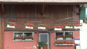 この写真はFeierlenhofの近隣の農家さん。軒下にはゼラニウムのプランターが置かれていて可愛らしい。古い馬具を天秤のように吊下げてあしらっているのがユニーク。