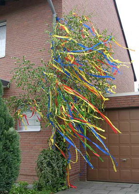 というのはここライン流域独特の一風変わったアピールの総称です。適当な大きさに切った白樺の若木を色とりどりの紙テープでデコレーション。時期になるとクリスマスツリーのように白樺の若木を売り出す店もあるようですが、